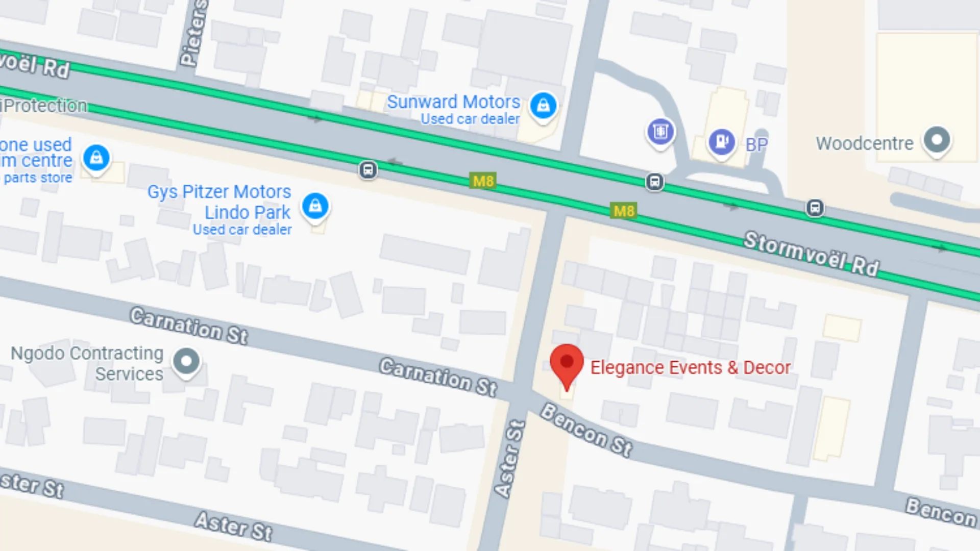 If Your Looking for Elegance Events & Décor, Were not far away. Elegance is Located just behind main road, Stormvoel Road, Just Opposite the Bp Petrol station. We right by Pristine Pro Car Wash.